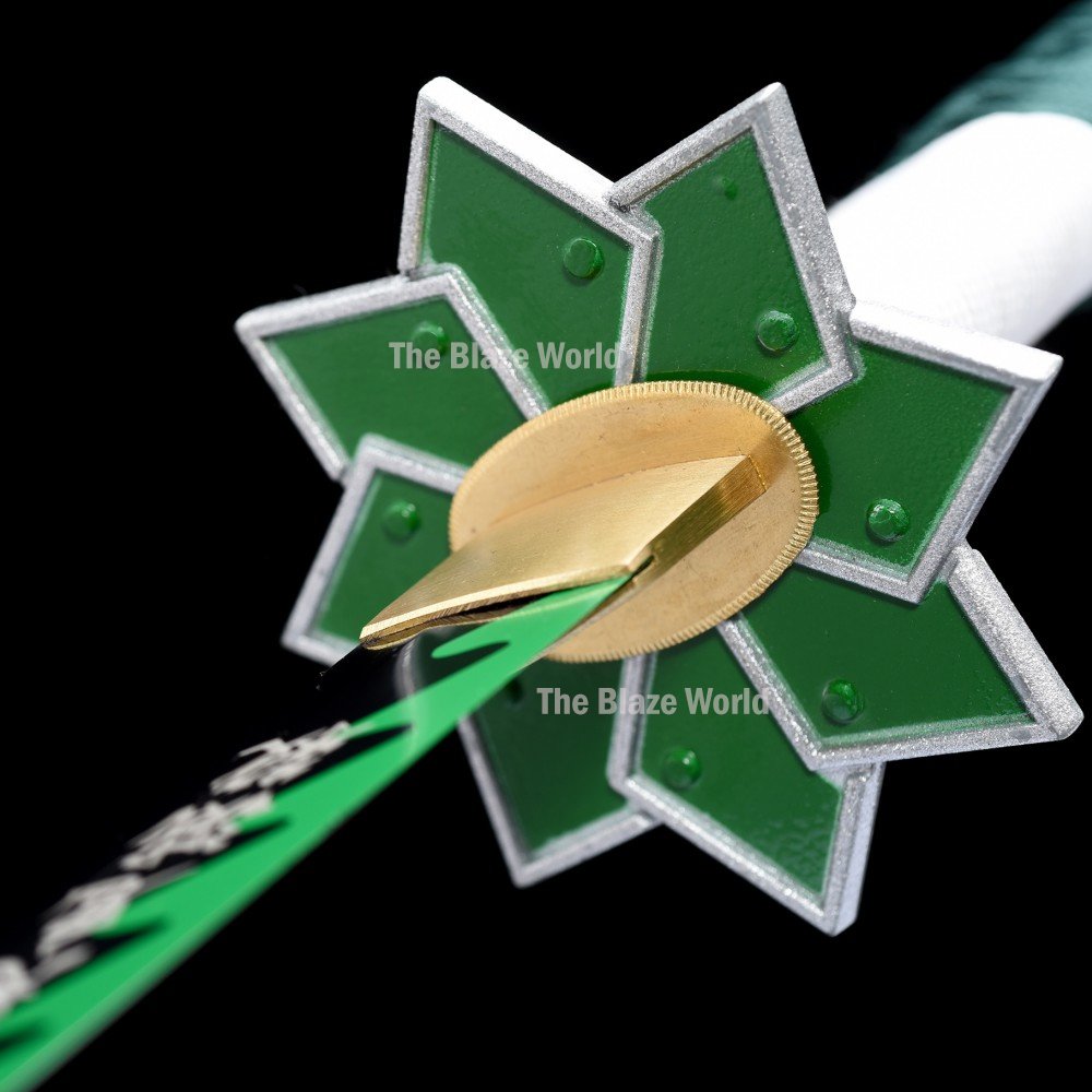 The handle is wrapped in white and green detailing, offering an authentic anime-style finish. The guard (tsuba) is designed with attractive detailing that enhances the overall premium appearance of the sword. It also includes a matching black scabbard with white design patterns, completing the full replica look.